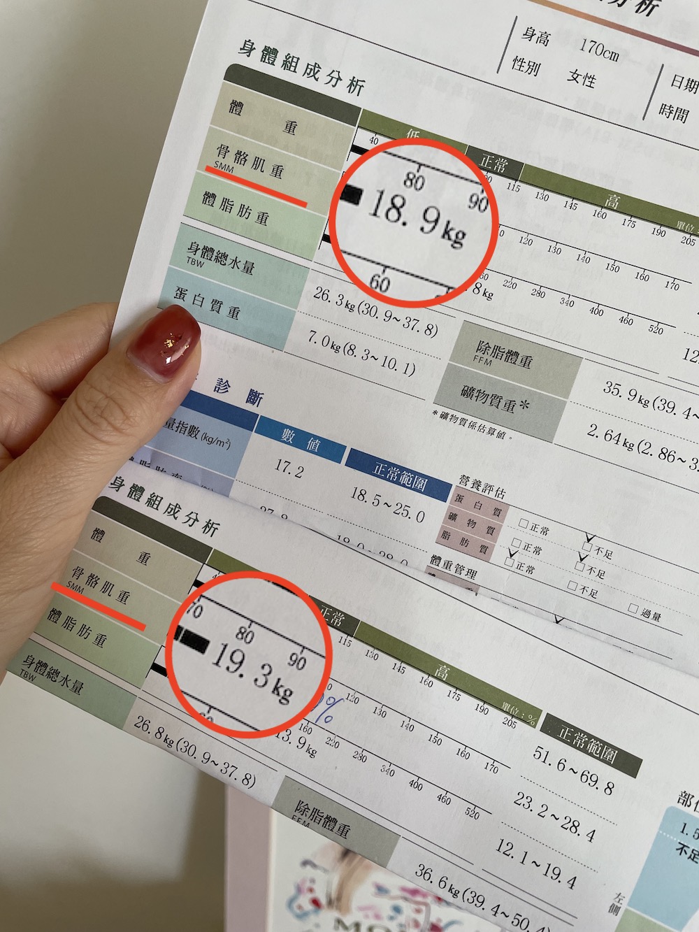 這一個月肌肉量從18。9成長到19。3,長了0。4公斤![]()